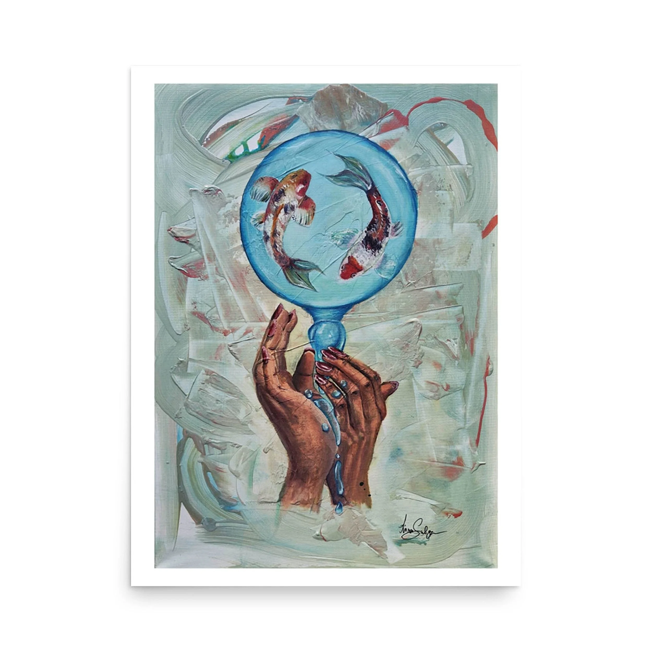 Abundance brings the energy of prosperity, openness, and ease into your space. Two koi fish swim within a water bubble, pouring water into open hands, a visual reminder that abundance flows naturally when you allow yourself to receive life’s goodness. The koi embody balance: giving and receiving, effort and ease, action and rest. The soft mint green background anchors this energy into trust, harmony, and the heart’s openness.